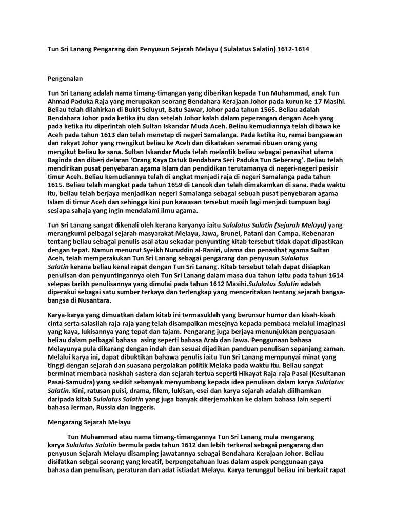 Sulalatus Salatin Tun Sri Lanang Pdf from demo.fdokumen.site * tun seri lanang yang dilahirkan pada tahun 1565 di kota seluyut, johor, lahir 54 tahun setelah kejatuhan melaka pada portugis. Tun sri lanang memiliki nama lengkap tun muhammad (lahir di selayut batu sawar, pada tahun 1565) adalah uleebalang pertama samalanga yang juga merupakan seorang sastrawan melayu. Ketokohannya membentang mulai dari seluyut, johor baru hingga aceh darussalam. Tun sri lanang was born in 1565 in seluyut, johore, and was descended from tun tahir, a brother of bendahara tun mutahir of malacca.3 there are not many records about his period as bendehara in johore. He served under two sultans of johor, namely; Tun muhammad bin tun ahmad, better known as tun sri lanang, was the bendahara (grand vizier) of the royal court of johor sultanate who lived between the 16th and 17th centuries. 1 he served under two sultans of johor, namely; However, during the rule of sultan alauddin riayat shah iii, he shouldered a heavier burden.